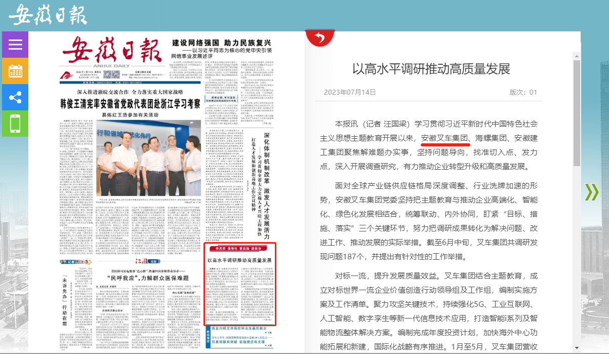 7月14日,《安徽日報(bào)》在頭版中就安徽叉車集團(tuán)以高水平調(diào)研推動高質(zhì)量發(fā)展情況進(jìn)行了報(bào)道。報(bào)道中表示,學(xué)習(xí)貫徹習(xí)近平新時(shí)代中國特色社會主義思想主題教育開展以來,安徽叉車集團(tuán)聚焦解難題辦實(shí)事,堅(jiān)持問題導(dǎo)向,找準(zhǔn)切入點(diǎn)、發(fā)力點(diǎn),深入開展調(diào)查研究,有力...